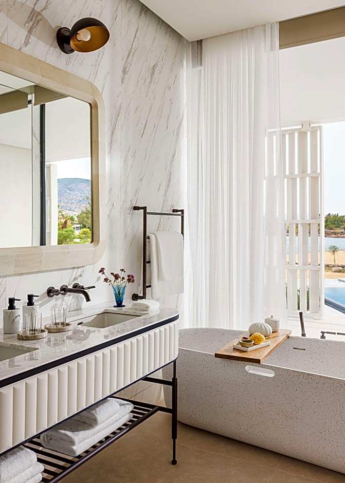 Providing free toiletries and bathrobes, this double room includes a private bathroom with a bath, a shower and a bidet. The spacious air-conditioned double room provides a flat-screen TV with streaming services, soundproof walls, a mini-bar, a tea and coffee maker as well as sea views. The unit offers 2 beds.